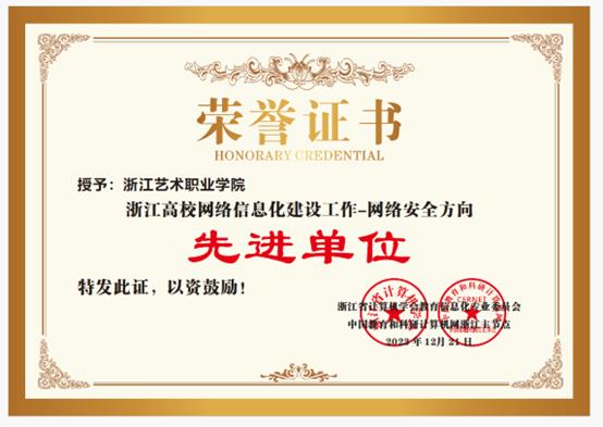 近日,浙江省计算机学会教育信息化专业委员会、中国教育和科研计算机网浙江主节点联合表彰了一批2023年高校网络信息化建设先进单位和先进个人。我校喜获“2023年浙江高校网络信息化建设先进单位-数字治理方向”、“2023年浙江高校网络信息化建设先进单位-网络安全方向”两项荣誉,图书信息中心卓然被评为“浙江高校网络信息化建设先进个人”。