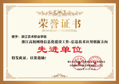 近日,浙江省计算机学会教育信息化专业委员会、中国教育和科研计算机网浙江主节点联合表彰了一批2024年高校网络信息化建设先进单位和先进个人。我校继2023年获浙江高校网络信息化建设工作 “网络安全”及“数字治理”两项先进单位荣誉后,2024年再获“浙江高校网络信息化建设工作-数字安全方向先进单位”、“浙江高校网络信息化建设工作-信息技术应用创新方向先进单位”两项荣誉,图书信息中心许衡老师被评为“浙江高校网络信息化建设先进个人”。