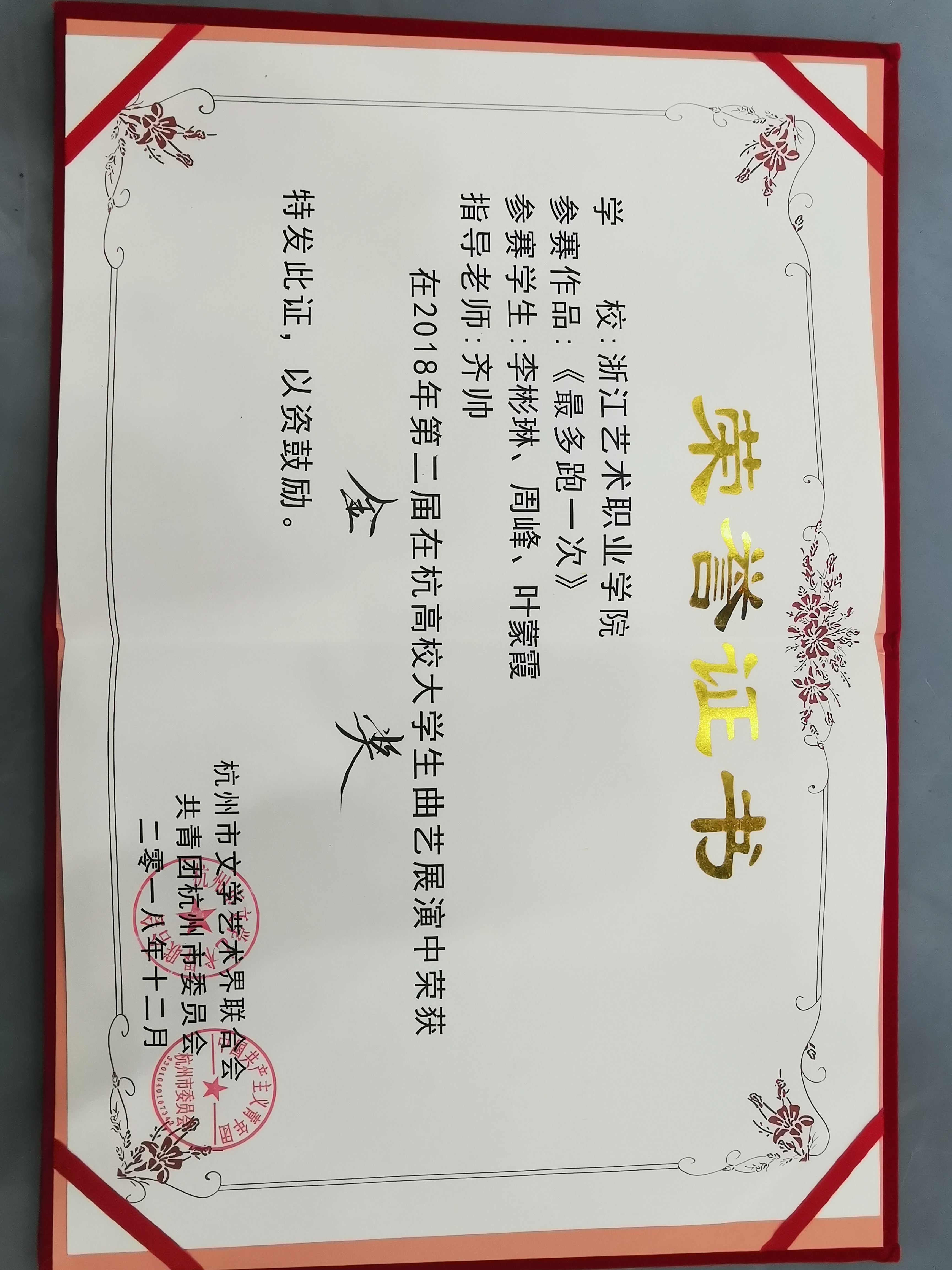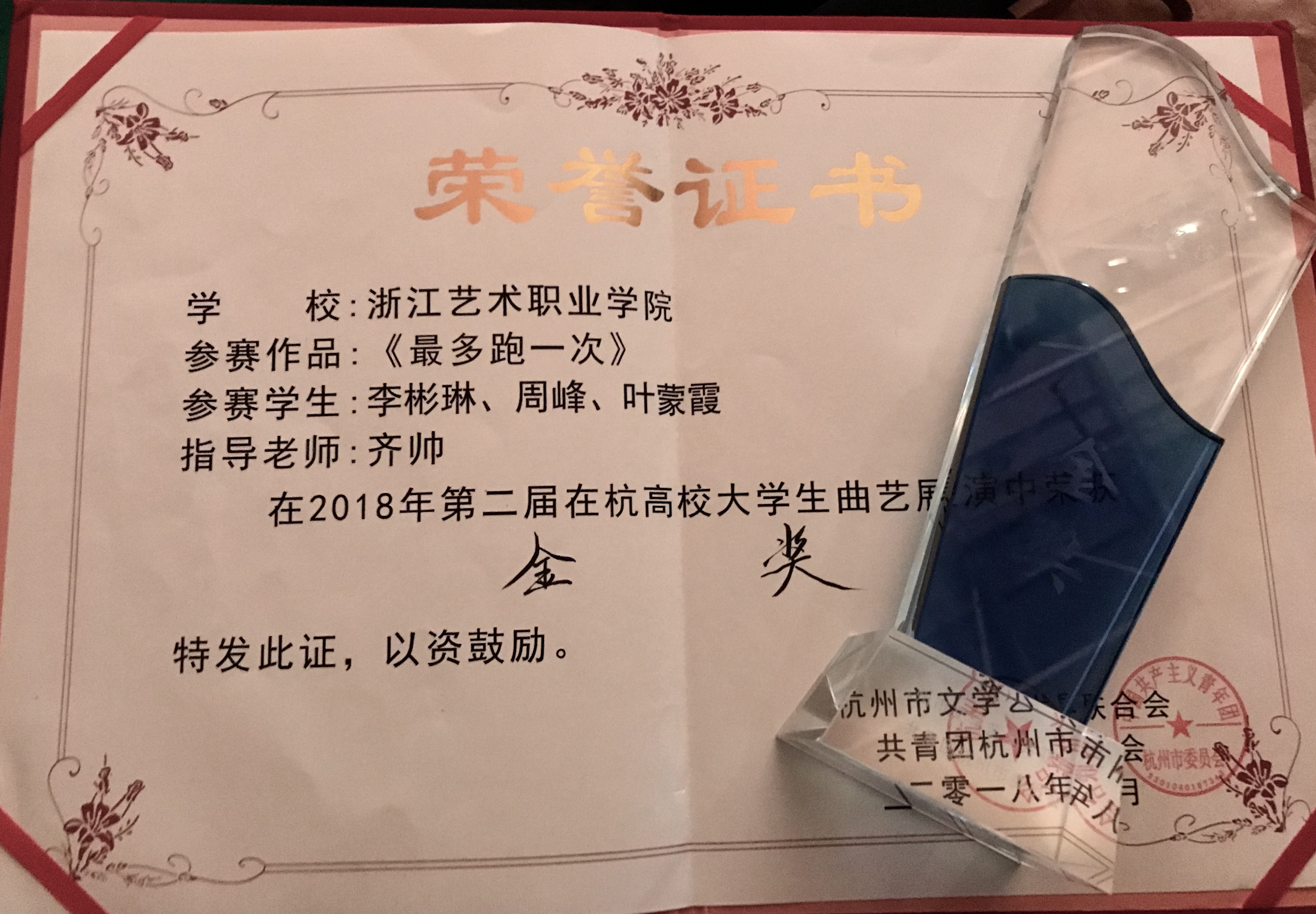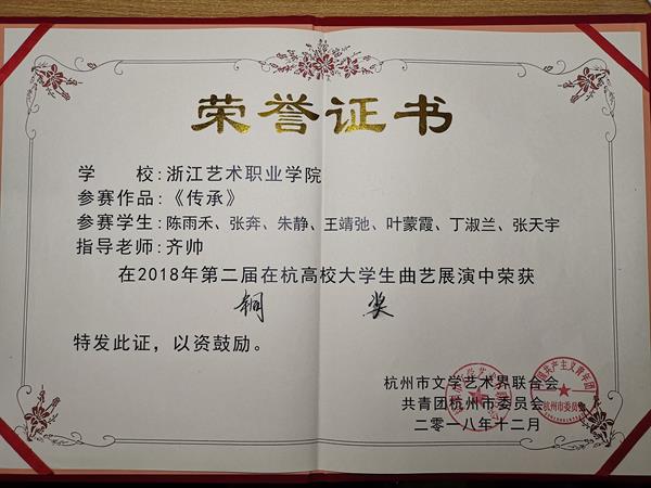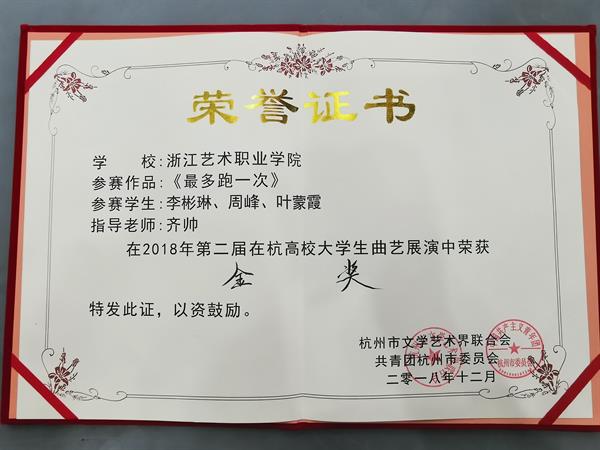 在此前举办的“庆祝改革开放40周年”第二届在杭高校大学生曲艺展演决赛中,由我校戏剧系齐帅老师指导、文化管理17级文化员定向李彬琳、周峰、叶蒙霞演绎的《最多跑一次》与陈雨禾、张奔等出演的《传承》两个原创小品分别斩金奖和铜奖。