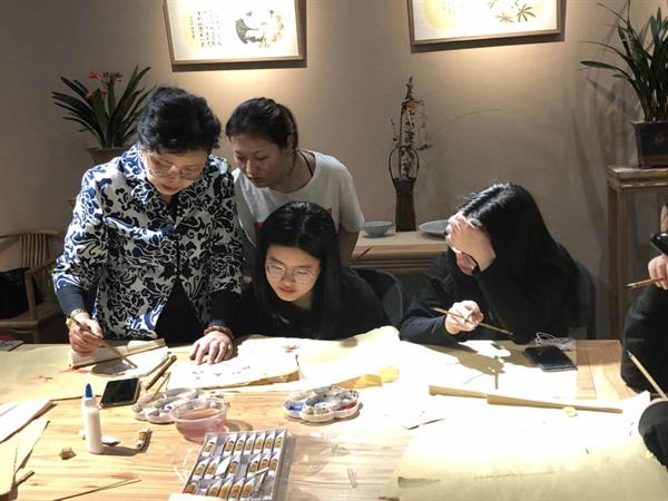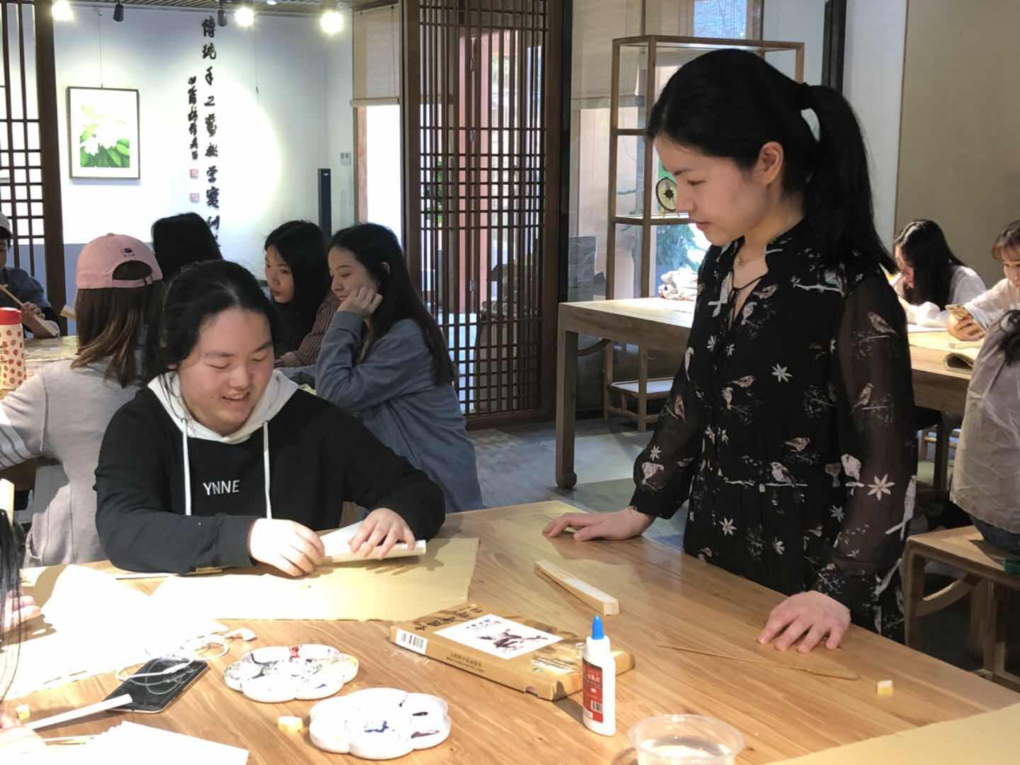 课上,游晓婷为同学们讲解了杭扇的制作流程、注意事项与扇面绘画技巧。赵平加拿出了工作室的扇绘作品启发同学们的灵感。两位老师根据学生所用花鸟和山水画临本的不同,进行了逐一的悉心指导。学生们学习和体验了穿面、扇面绘画等杭扇工艺制作流程,一笔一画,精雕细琢。