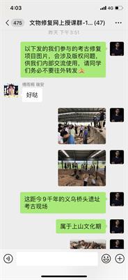 文物修复与保护专业核心课程有文物鉴定、文物修复、古籍修复、书画修复、陶艺基础与修补等。教研室教师们通过微信平台、抖音直播等方式开展丰富多样的实践课程。如文物修复课程第一课通过抛出问题、解决问题的形式开展,抛出问题古陶瓷修复中文物修复的形式与其他修复形式的不同点和意义,让同学们查看资料,了解什么是文物,陶瓷修复的种类及特点等,了解文物的定义、修复的工艺及原则,更好地为后期的修复对象制定可行性方案,实施合理的修复手段。