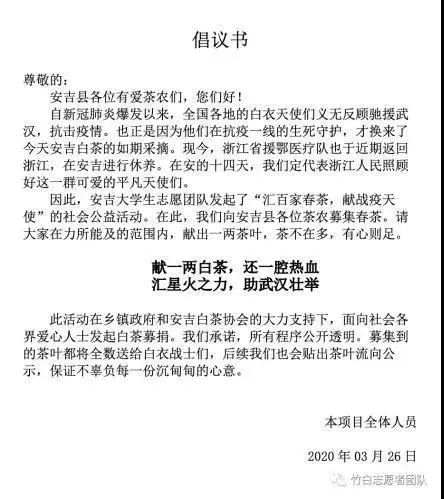 春茶自造始开尝,色味甘新气芬馥。时逢白茶采摘季,湖州市安吉县有这样一批大学生,为感谢在安吉休养的浙江援鄂医务人员,发起“汇百家春茶,献抗疫天使”社会公益活动,把经历一冬滋养的春茶,送给医务人员品尝。活动发起人为我系18公共文化(定向)1班管涵婧和宁波诺丁汉大学叶子、北京体育大学陈淑莹。