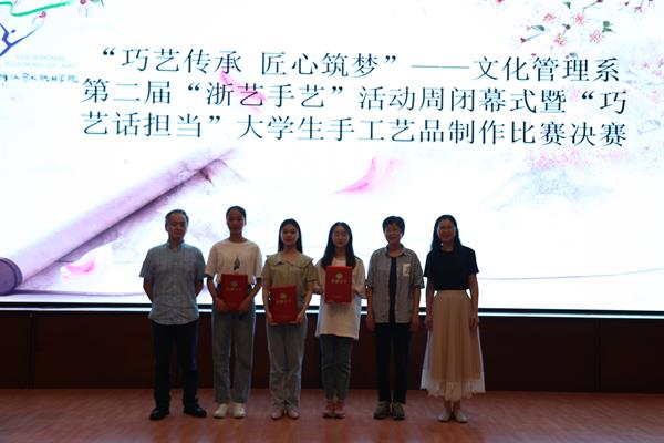 23日晚,文化管理系在图信开展第二届“浙艺手艺”活动周闭幕式暨“巧艺话担当”大学生手工艺品制作比赛决赛。校党委委员、副院长沈军甫、文化管理系班子、系教师代表、六系团总支书记、六系学生会主席团成员和系学生代表参加活动。