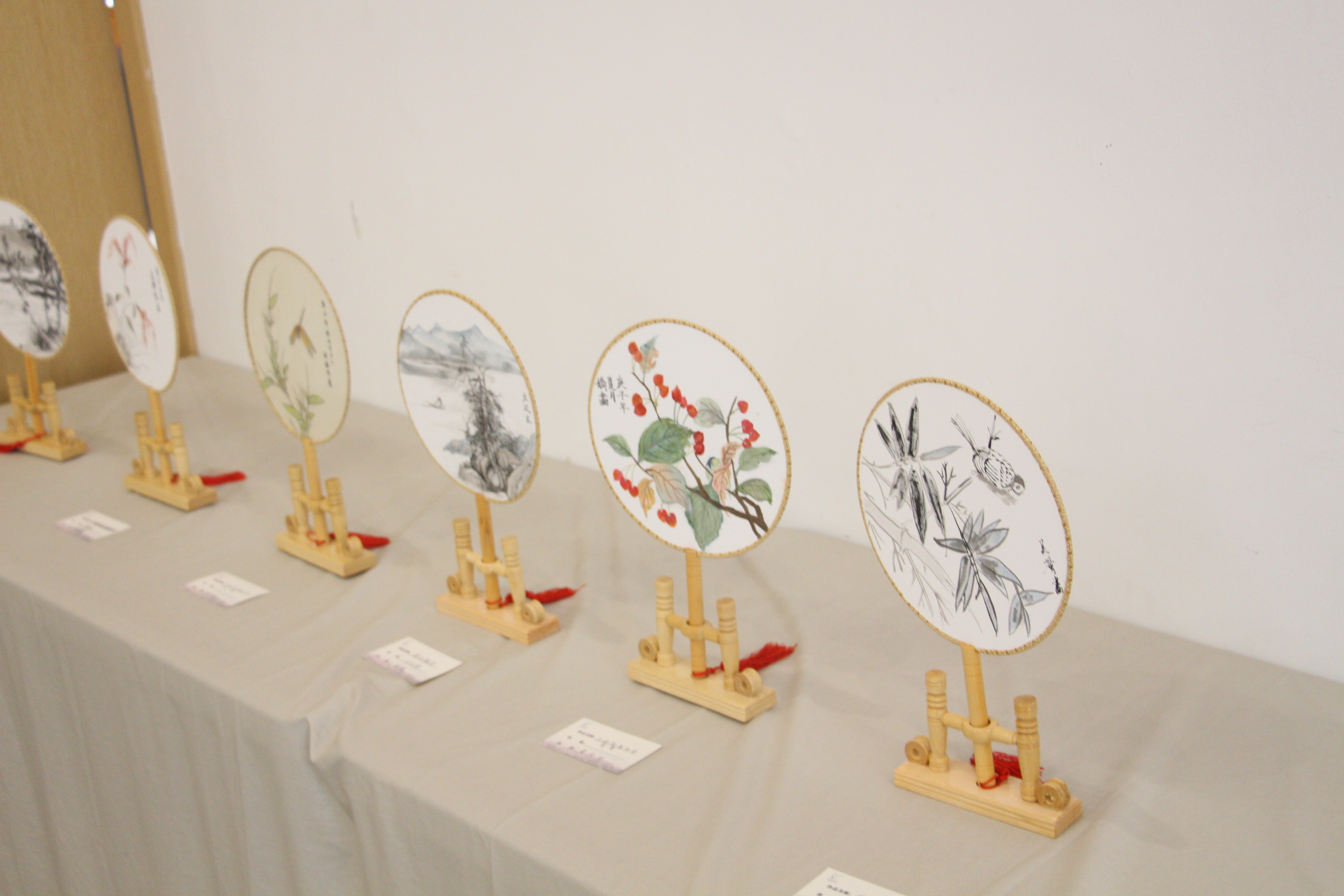 18文物修复班颜彬彬同学的工笔画团扇《红芙蓉图》临摹自南宋李迪院体花鸟画《红芙蓉图》,将芙蓉花瓣不同形态及色彩细微变化的特征呈现于扇面之上。
