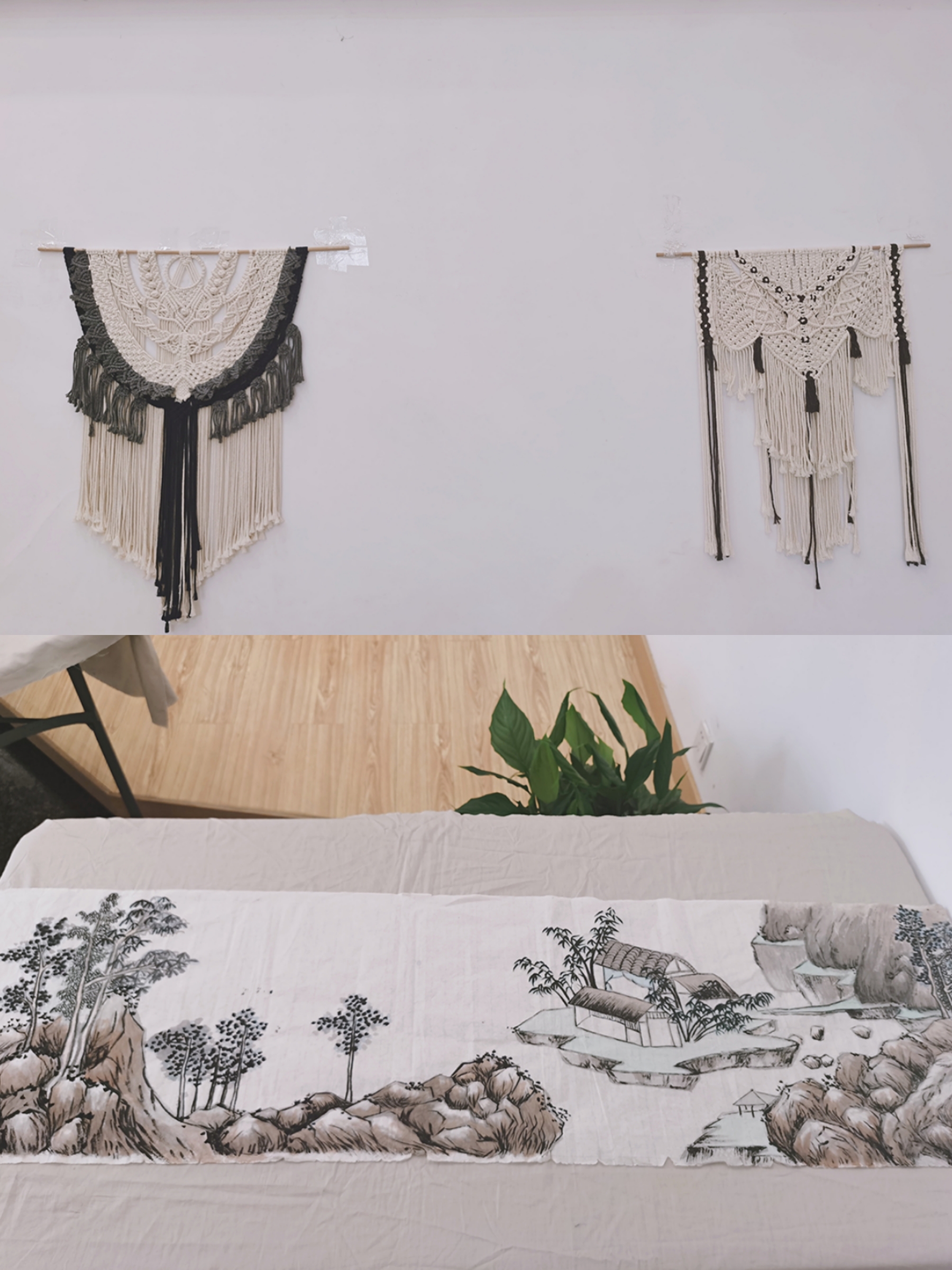 18环艺班张月的编织挂毯《路漫漫》以白绳为主,运用深色点缀,并采用半圆弧形为结构,寓意每个人的一生都能少许磕绊,顺顺利利。
