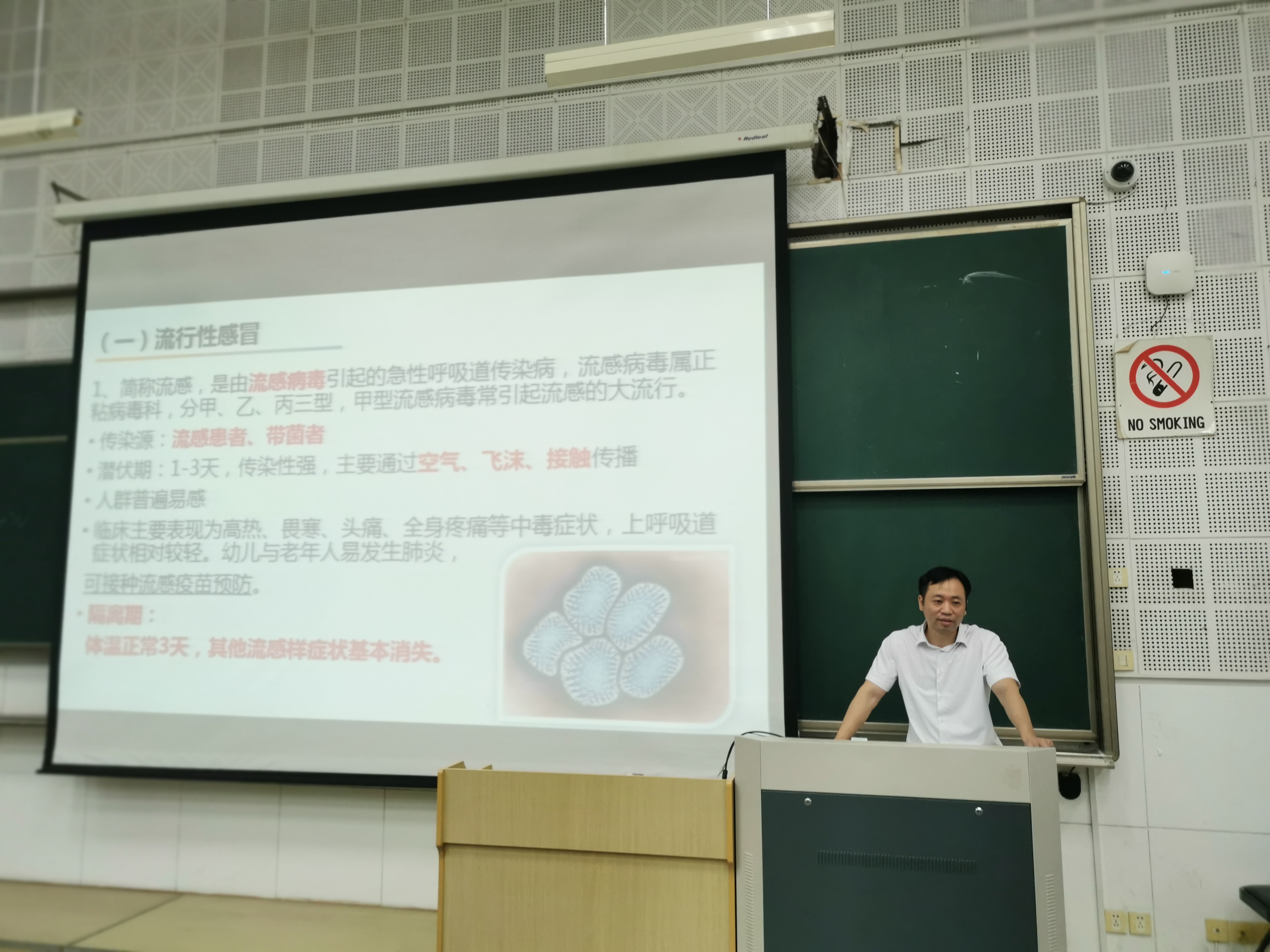 廖主任有二十余年的临床内科疾病诊治经验,积累了丰富的流行性疾病防控诊治经验。他通过丰富的视频和图片资料,阐述了秋冬季高发的流行性感冒、水痘、诺如病毒感染、急性出血性结膜炎、肺结核、手足口病、新冠肺炎的发病原理、传播途径和预防措施。告诫同学们勤洗手,勤通风,注意个人卫生习惯,身体不舒服及时与老师联系争取做到早发现,早报告,早处理。