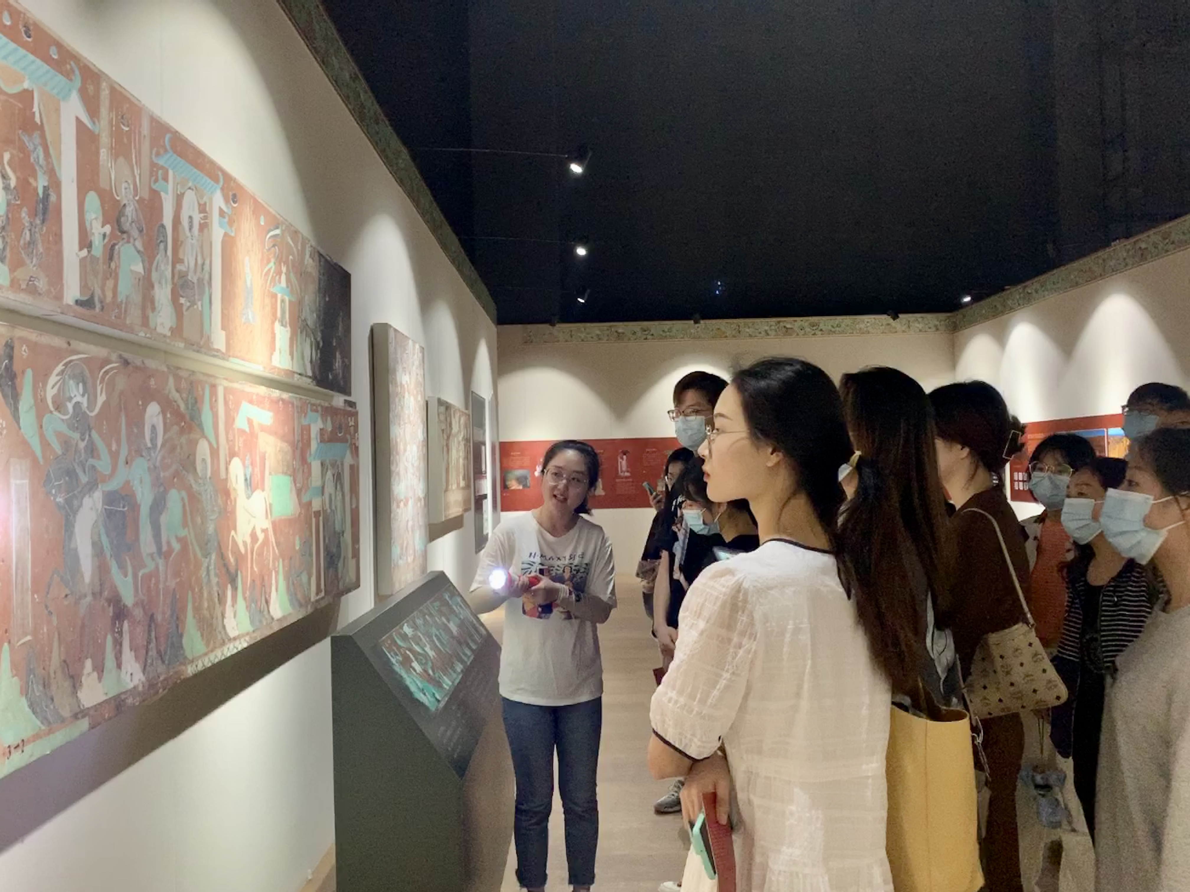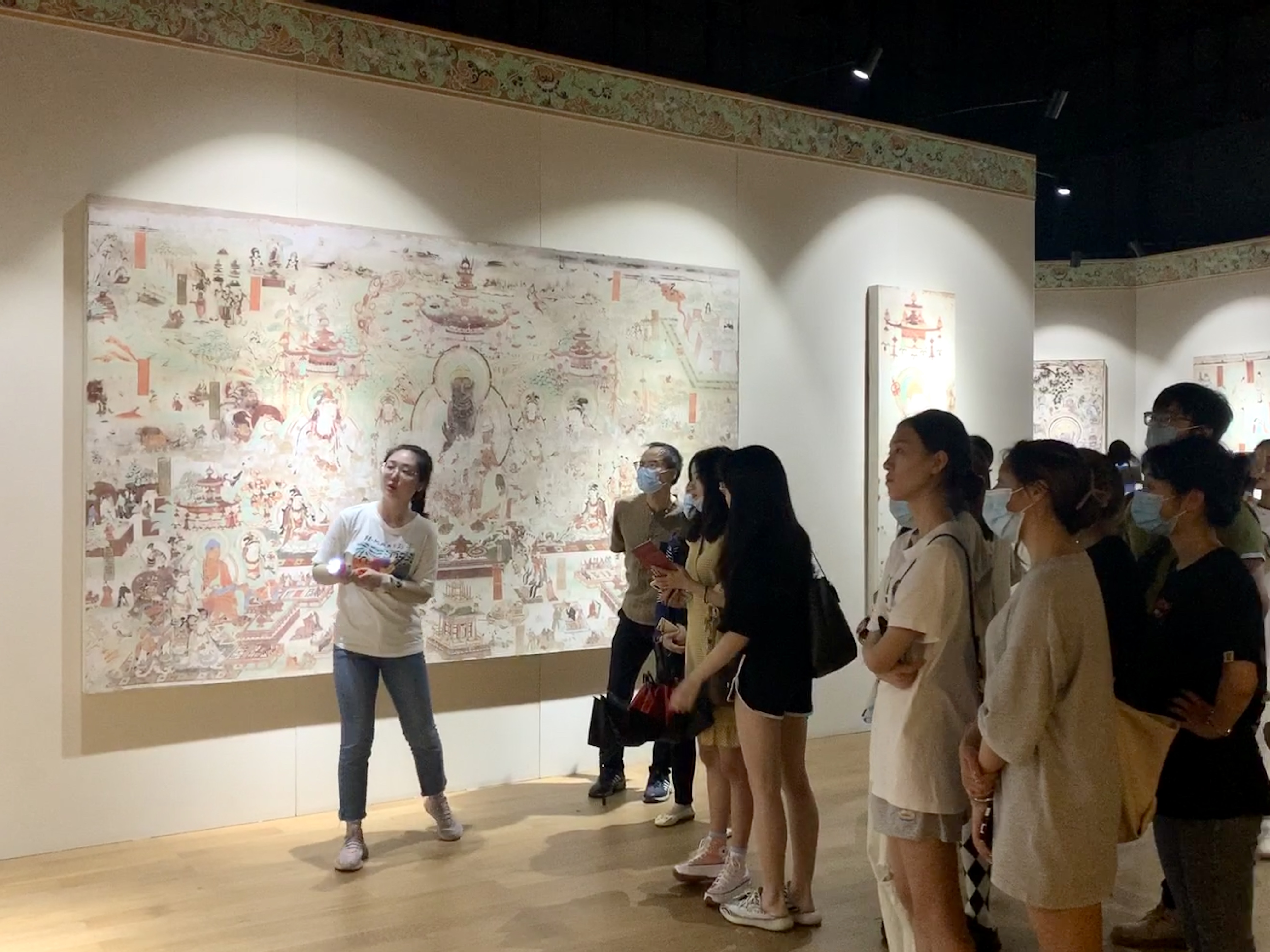 展厅展陈了莫高窟的石窟艺术,分为早期、中期、晚期三个阶段。讲解员带领师生走近敦煌壁画艺术,讲述莫高窟的大事记。敦煌石窟和敦煌藏经洞出土的文物浓缩了中古敦煌的历史,形象地记载了在开放背景下欧亚文明的互动、汉民族与其他民族的交融;反映了4—14世纪一千多年间佛教及艺术的流传及流变;保存了丰富生动的中外艺术形象及艺术的源流传承;展示了中古时期广阔的政治、军事、文化、科技等社会生活的场景,具有超越时空经久不衰的魅力,在不同时代、不同民族、不同信仰、不同地域的人们中间产生共鸣。这也正是中华民族以自己的优秀文化为世界做出的贡献之一。