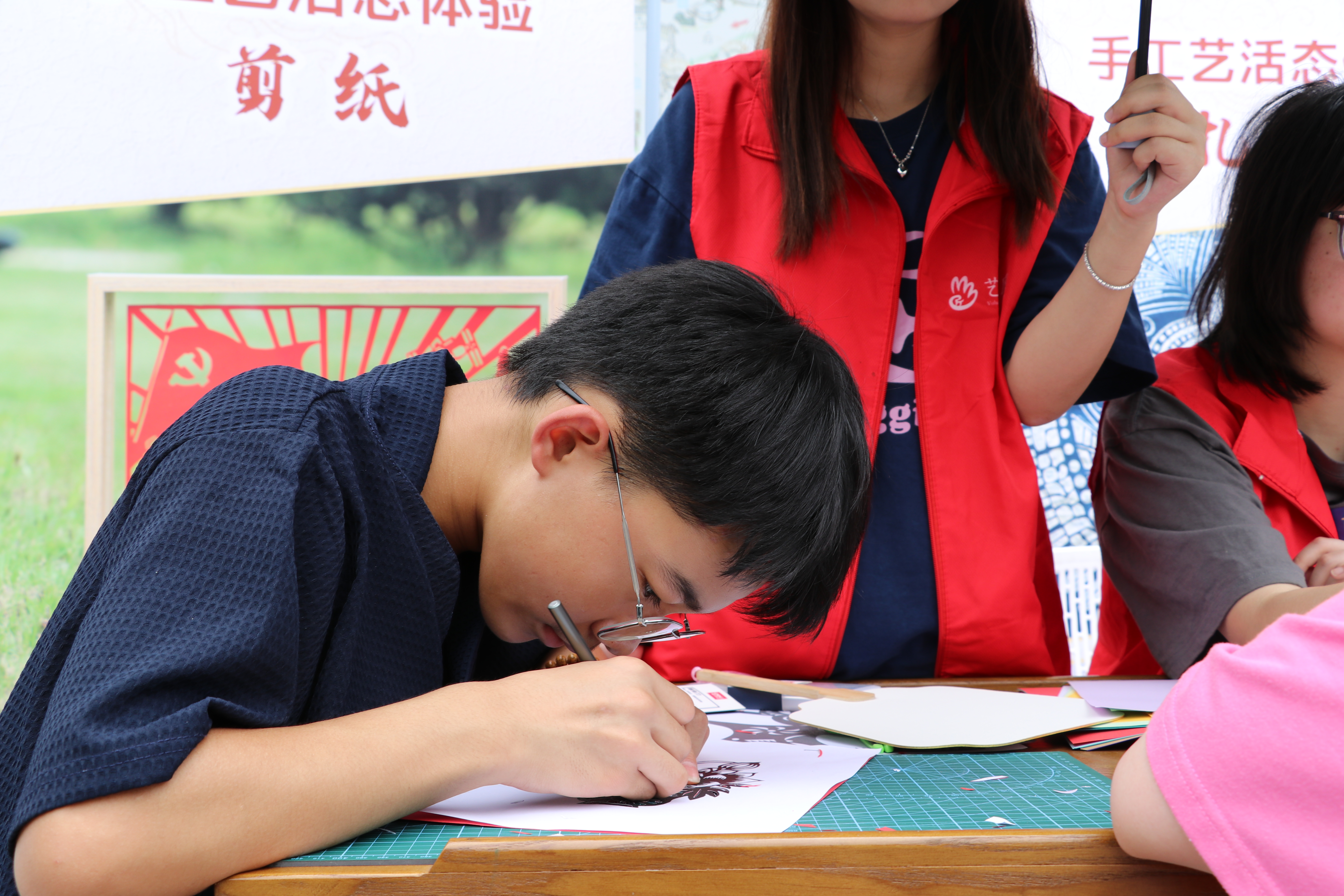 在剪纸的摊位上,艺小匠同学为体验者讲解刻刀的正确使用方法并细心指导剪纸,村民们聚精会神,每一刀的力度都尽力把握,开始虽有些许吃力,但经过适应逐步体验到了剪纸的精髓与乐趣所在。