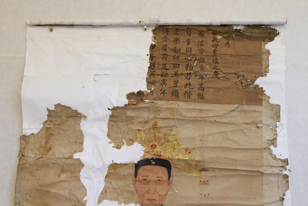 两件需要修复的画像为仙居县溪港乡塘弄村王氏家族所藏清代画像,因年代久远加保存不当,画像出现了霉烂、糟朽、絮化、脆化、掉色、断裂、虫蚀等病害,已不适合长期保存与展示,故需进行紧急修复。画幅装裱形式为传统手工纸镶绫边,均伴有大面积糟朽及缺失,两幅画像天头画赞处均大面积缺失,仅存右边一半,画幅有多处折痕及贯穿伤,因保存不当受潮后大面积滋生霉菌,颜料极易剥落,在前期的保存过程中背后有使用过大面积化工胶水及多层A4纸叠粘,整个修复过程难度较大。