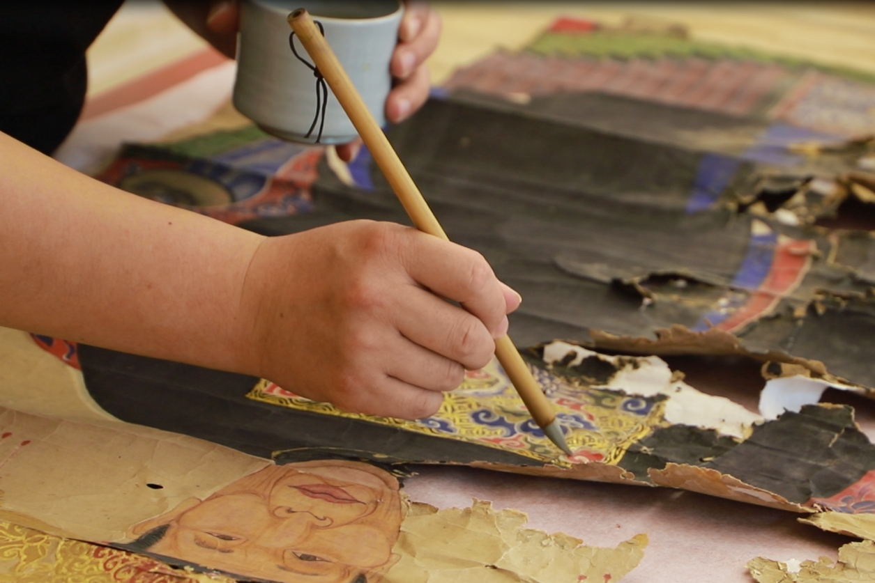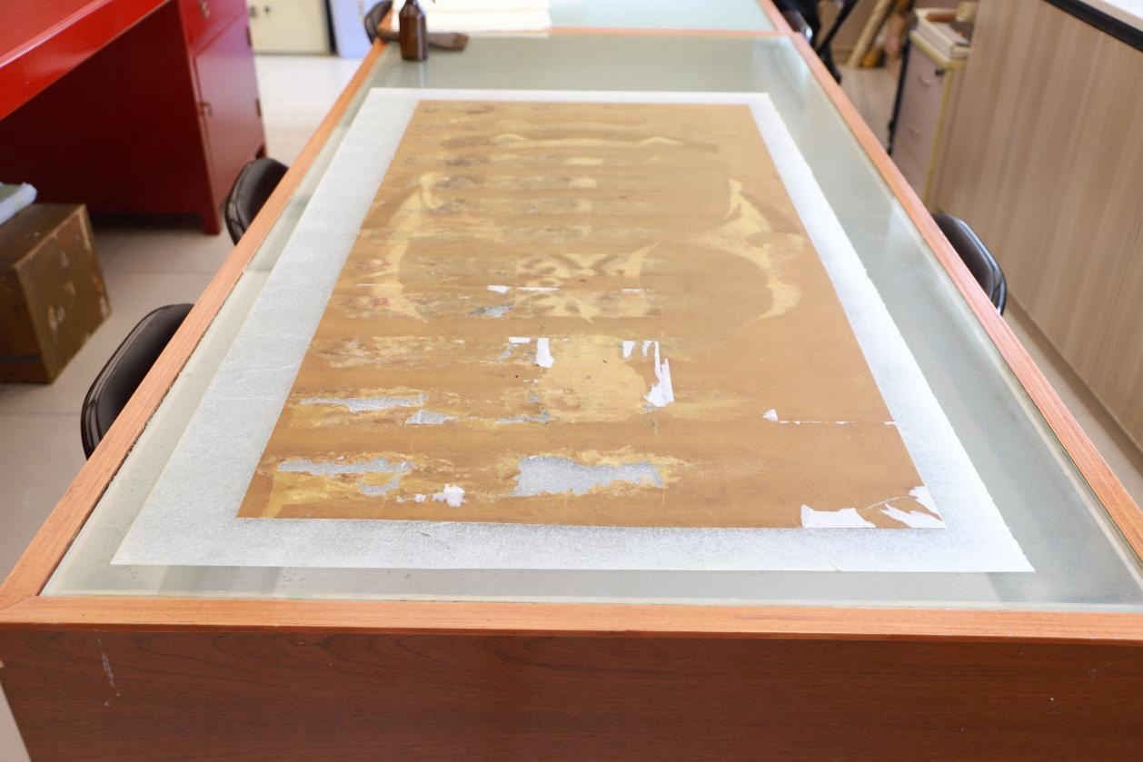 第三,因画幅缺失面积大,糟朽严重,所以在保证胶矾水打到位后需要根据画芯原有颜色将缺失部分填上,根据不同位置颜色进行不断调整,最终达到与画心一致。