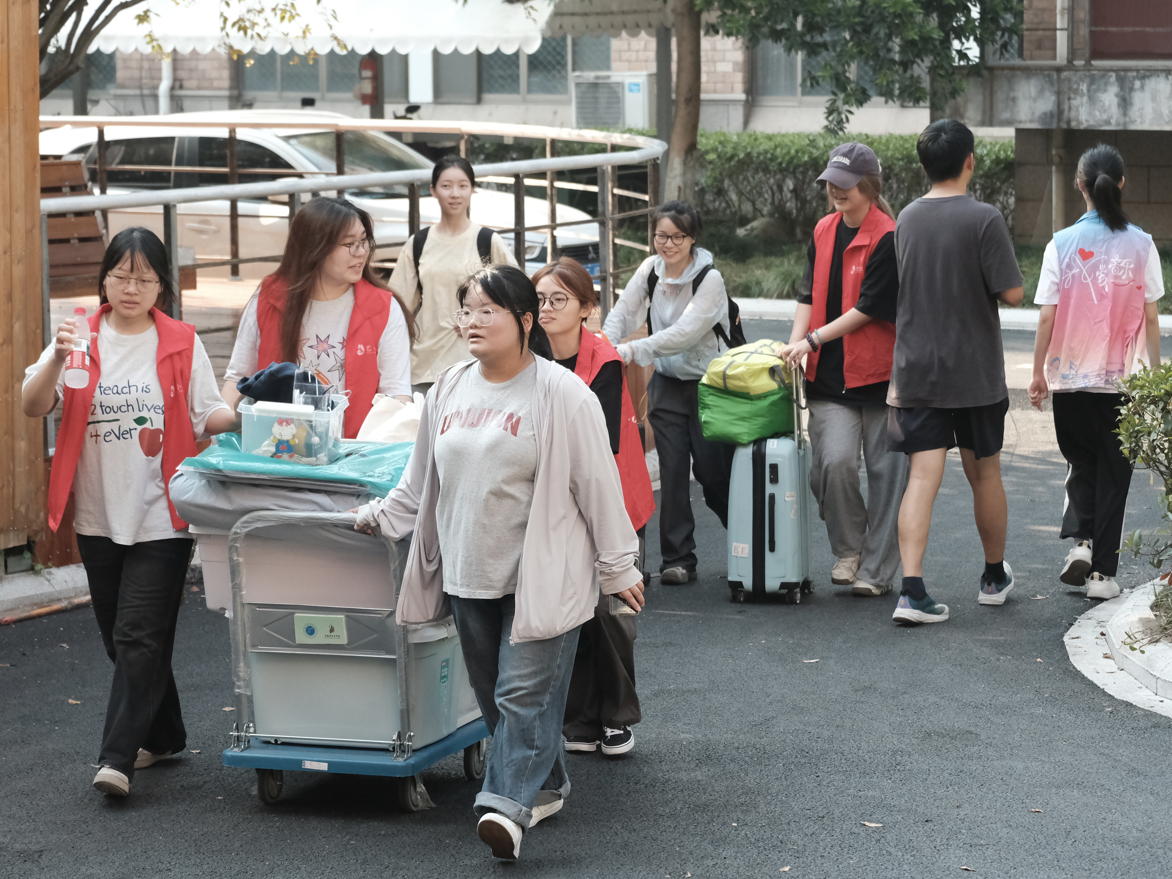 当天,“艺小匠”们主动上前接过新生手中的行李,引导校园路线,助力新生顺利抵达宿舍。新生与家长默契配合,在寝室内有条不紊地整理床铺、收纳物品,迅速将新“小家”布置得整洁温馨。志愿者们的贴心服务赢得了新生及家长的一致好评