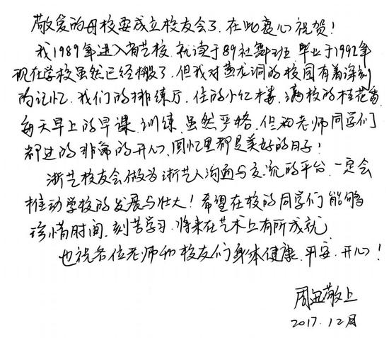 浙艺校友周迅、董卿发来贺信。在信息化时代,周迅选择了亲笔书写这样一种温馨的方式送上对母校的祝福。她说“敬爱的母校要成立校友会了,在此衷心祝贺。我1989年进入省艺校,就读于89社舞班,毕业于1992年。现在学校虽然已经搬了,但我对黄龙洞的校园有着深刻的记忆:我们的排练厅、住的小红楼,满校的桂花香,每天早上的早课、训练,虽然严格,但和老师同学们都过得非常开心。回忆里都是美好的日子。”董卿在贺信中说,欣闻浙江艺术职业学院校友会成立,谨向母校全体师生和广大校友致以热烈的祝贺!愿校友们为学校的历史书写更加光辉灿烂的篇章,祝浙艺越办越好!