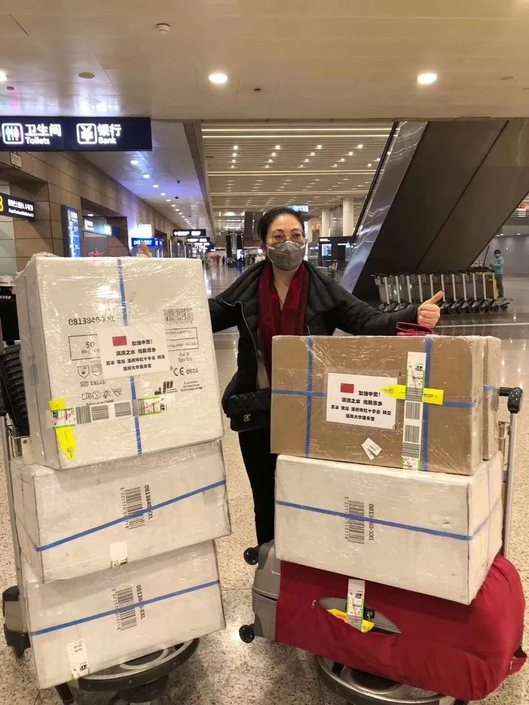 2月13日清早8点,我一人推两辆满满当当的行李车,终于出现在浦东国际机场,我在法国采购的 7大箱医疗物资终于顺利通关,这里面有几千只口罩(具体数量我已经记不得了)、200套医用防护服,测温枪、酒精棉,这是我在法国扫货的成果,全部捐献给这次疫情的重灾区之一——温州,能让在一线战斗的医务和社区工作者用上,我也心安了。
