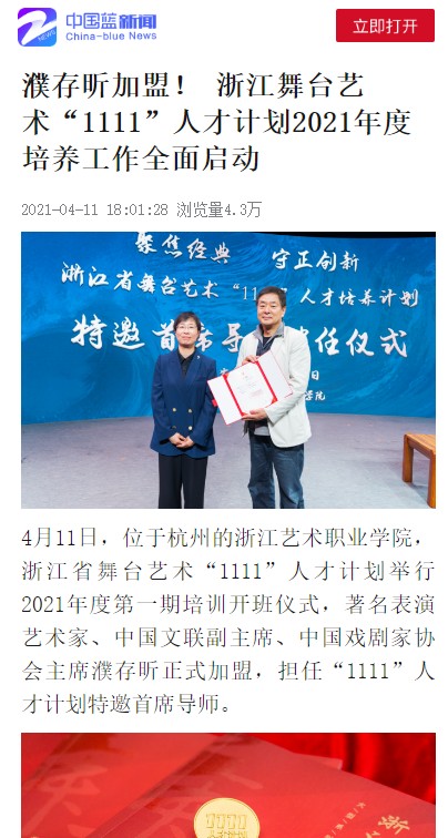 4月11日,位于杭州的浙江艺术职业学院,浙江省舞台艺术“1111”人才计划举行2021年度第一期培训开班仪式,著名表演艺术家、中国文联副主席、中国戏剧家协会主席濮存昕正式加盟,担任“1111”人才计划特邀首席导师。