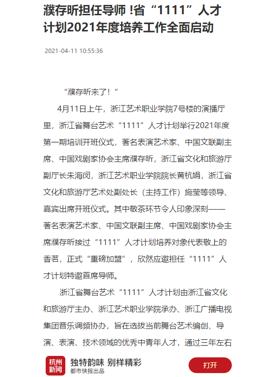 4月11日上午,浙江艺术职业学院7号楼的演播厅里,浙江省舞台艺术“1111”人才计划举行2021年度第一期培训开班仪式,著名表演艺术家、中国文联副主席、中国戏剧家协会主席濮存昕,浙江省文化和旅游厅副厅长朱海闵,浙江艺术职业学院院长黄杭娟,浙江省文化和旅游厅艺术处副处长(主持工作)施莹等领导、嘉宾出席开班仪式。其中敬茶环节令人印象深刻——著名表演艺术家、中国文联副主席、中国戏剧家协会主席濮存昕接过“1111”人才计划培养对象代表敬上的香茗,正式“重磅加盟”,欣然应邀担任“1111”人才计划特邀首席导师。
