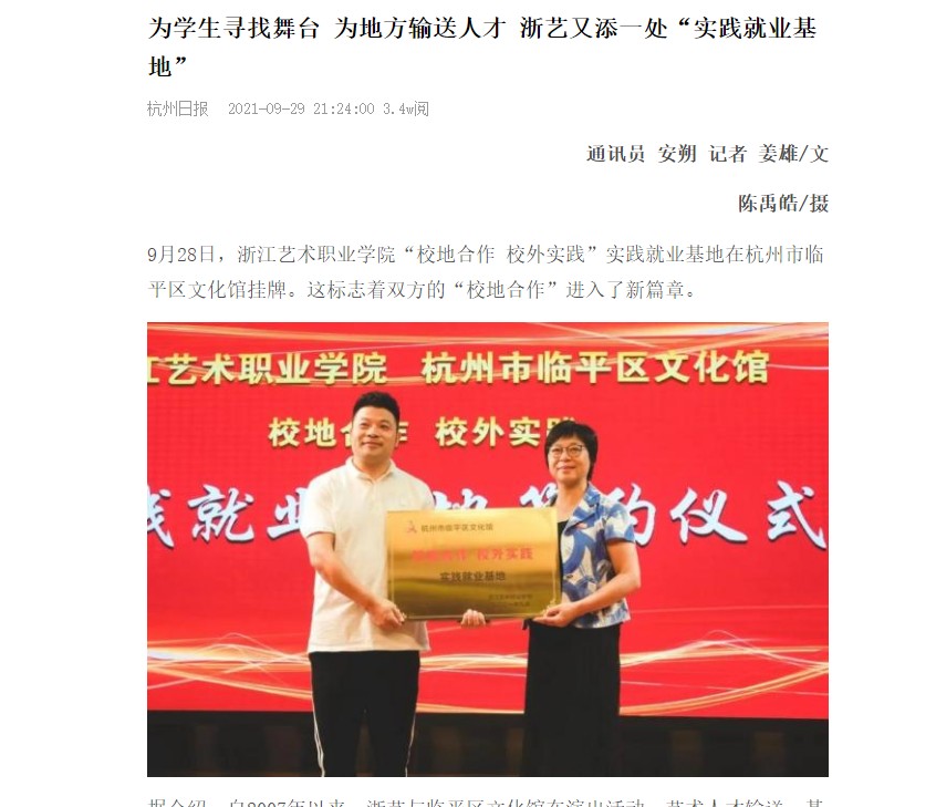 9月28日,浙江艺术职业学院“校地合作 校外实践”实践就业基地在杭州市临平区文化馆挂牌。这标志着双方的“校地合作”进入了新篇章。