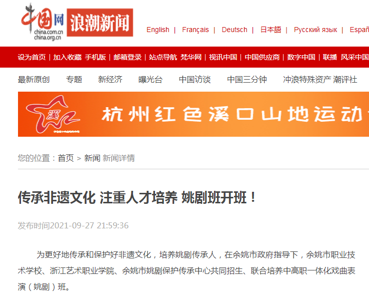 为更好地传承和保护好非遗文化,培养姚剧传承人,在余姚市政府指导下,余姚市职业技术学校、浙江艺术职业学院、余姚市姚剧保护传承中心共同招生、联合培养中高职一体化戏曲表演(姚剧)班。