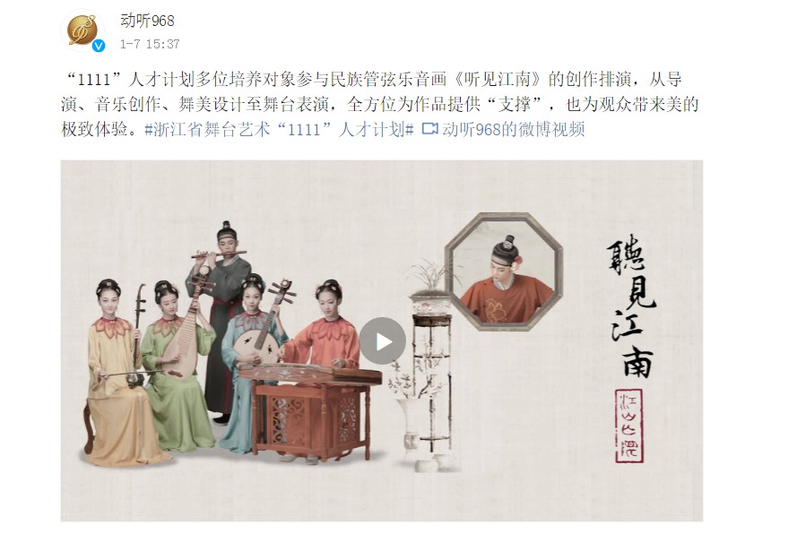 动听968微博:“1111”人才计划多位培养对象参与民族管弦乐音画《听见江南》的创作排演