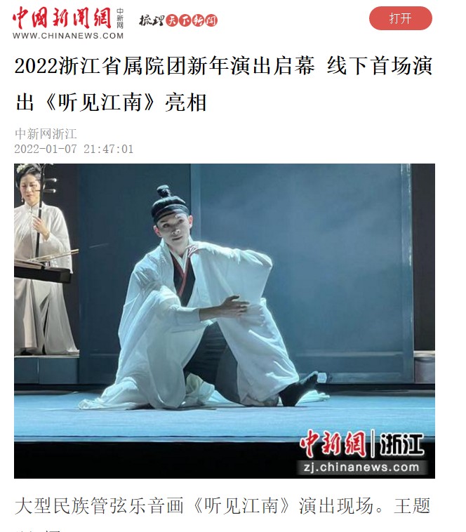 中新网浙江新闻1月7日电 (王题题 俞珂瑶)心中有诗意,何处不江南。6日晚,2022浙江省属院团新年演出季线下第一场演出大型民族管弦乐音画《听见江南》(下称“《听见江南》”)在浙江杭州上演。
