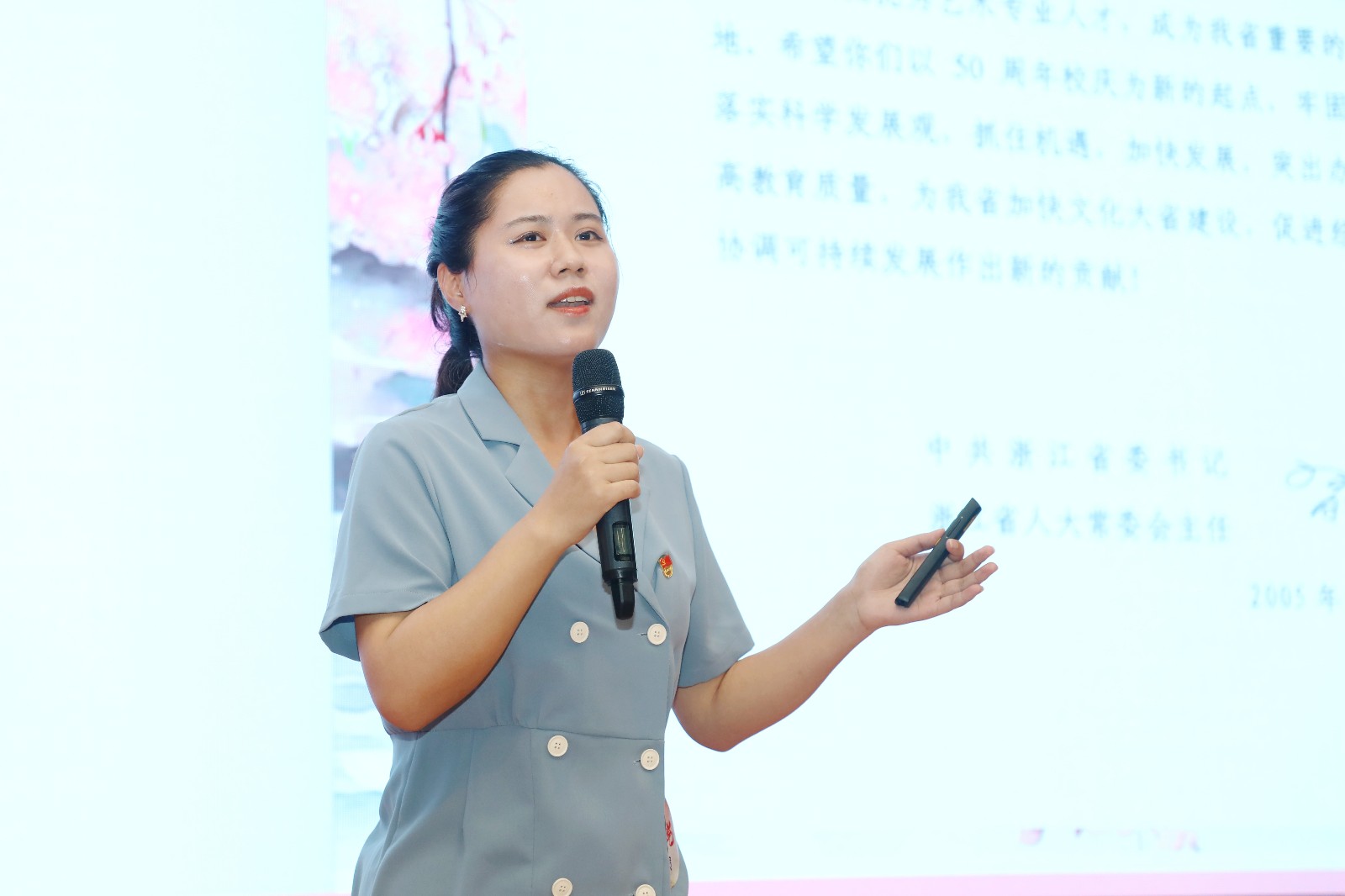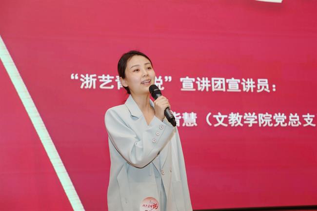 戏曲学院教师柴轶佳从自身经历入手,讲述了自己学艺从艺,传承中华民族优秀传统文化的故事。音乐学院学生闻人柯婷以红歌《没有共产党就没有新中国》为切入点,讲述我们为什么要学唱红歌,用一个个历史故事呼唤大家要扛起历史使命。戏剧影视学院辅导员刘苏宁带大家探寻了浙艺金鹄电影节的发展历程和取得的可喜成绩。纪委办公室教师单烨从八项规定看制度之变,生动解读一项项规定,呼吁大家交出新时代作风答卷。宣传部教师俞珂瑶讲述了浙艺优秀的原创作品《红船》和《清溪谣》,呼唤新时代青年用文艺吹响时代号角。舞蹈学院组织员王芳芳以建团百年为背景,呼吁浙艺学子要传承革命信仰,勇挑重担。文化管理与教育学院学生许愿以自己家乡余村为例,讲述了“小山村”的共富之路。马克思主义学院教师蔡秀通过讲述从古至今中华民族的优秀传统文化,深刻解读了文化自信的重要性。手工艺学院教师高迅从电视剧《觉醒年代》切入,结合历史人物的事迹来讲述版画人的历史使命。文化管理与教育学院教师王皆慧通过讲述自己创排的话剧《凌河影人》《1977》,表达了坚守理想的力量。