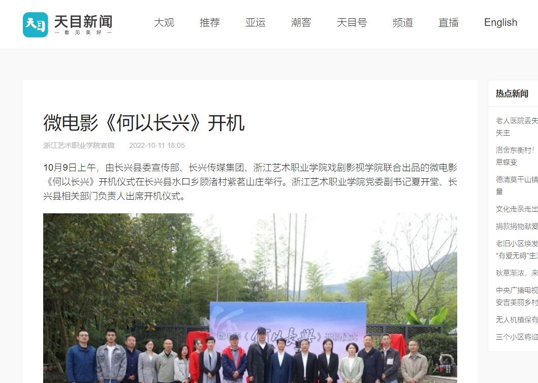 在接到任务后,戏剧影视学院迅速成立了以戏剧影视创作中心为项目主体的创作组。创作组十余名师生在国庆放假期间前往湖州市长兴县进行了拍摄前的实地堪景工作。那刚表示,“这是戏剧影视创作中心成立以来,首次整合各专业力量合力打造的影视作品,也是戏剧影视学院积极探索影视创作综合实践模式,开展‘产、学、研、创’一体化路径的又一次有益尝试。希望通过实战演练,进一步提升教师职业岗位能力,促进影视生产各专业融合,增强团队凝聚力意识,激发师生创造性活力,打响影视作品的‘浙艺制造’。”