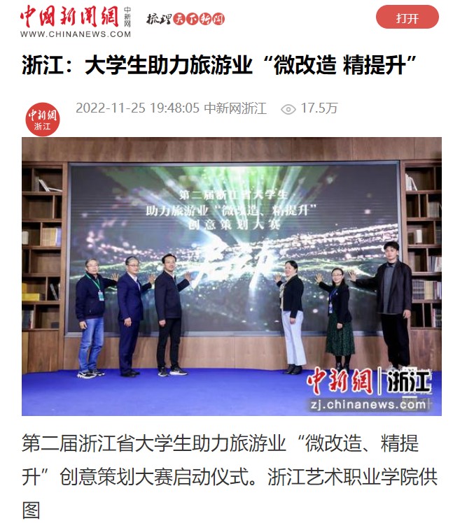 中新网浙江新闻11月25日电(童笑雨)11月24日,由浙江省文化和旅游厅主办的首届浙江省大学生助力旅游业“微改造、精提升”创意策划大赛决赛暨颁奖典礼在浙江省杭州市良渚国际研学中心举行。