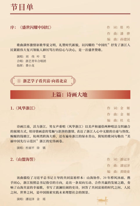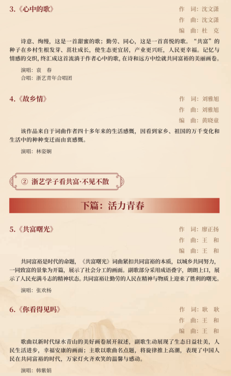 作为2021年度浙江文化艺术发展基金资助项目,这台音乐会以浙江推进共同富裕的实践过程为脉络,在全校范围内广泛征稿,组织音乐学院作曲理论教研室、声乐教研室、流行音乐教研室等部门创作了一批反映浙江人民推进共同富裕进程的优秀原创歌曲,以独唱、重唱、合唱等演唱形式展现浙江在高质量发展建设共同富裕示范区进程中涌现出的动人故事,唱响“共同富裕看浙江”的时代强音,学习贯彻党的二十大精神。