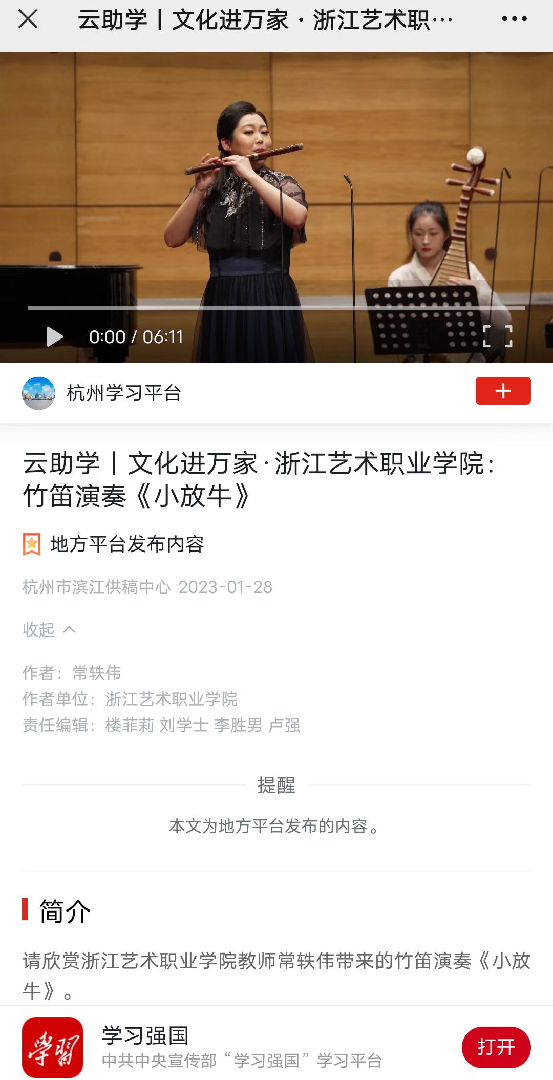 学习强国杭州平台:云助学丨文化进万家·浙江艺术职业学院:竹笛演奏《小放牛》
