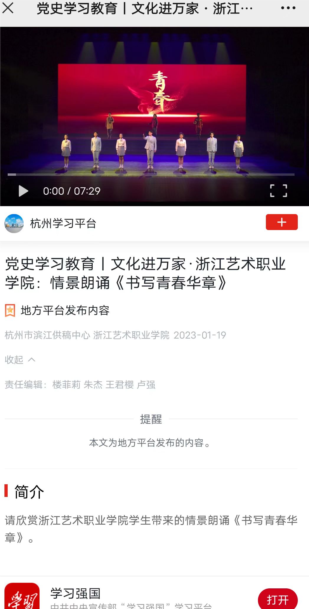 学习强国杭州平台:党史学习教育丨文化进万家·浙江艺术职业学院:情景朗诵《书写青春华章》