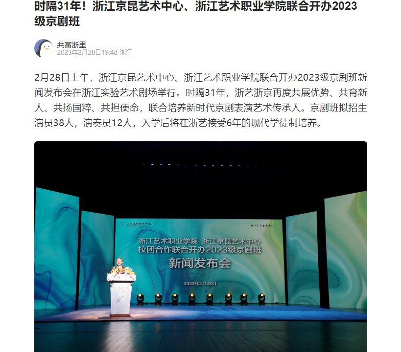 2月28日上午,浙江京昆艺术中心、浙江艺术职业学院联合开办2023级京剧班新闻发布会在浙江实验艺术剧场举行。时隔31年,浙艺浙京再度共展优势、共育新人、共扬国粹、共担使命,联合培养新时代京剧表演艺术传承人。京剧班拟招生演员38人,演奏员12人,入学后将在浙艺接受6年的现代学徒制培养。