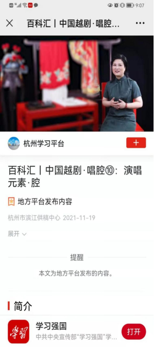 说做就做,由浙艺戏曲学院副院长周伟君领衔研发,戏曲学院戏曲表演专业教学团队的老师们群策群力开始了课程建设。周伟君介绍,《中国越剧·唱腔》课程可以满足各类人群学习越剧唱腔的需要,兼具专业性与可观性。课程先后在智慧树平台、浙江文化干部网络学院平台及“学习强国”平台上线,面向全省专业、民营文艺表演团体演职员开放,年选课量达到20000人次。她希望能有更多人通过课程喜欢越剧,爱上越剧,让更多人加入到传承越剧这一民族艺术瑰宝的事业中来,让越剧人心中的光永远亮下去。