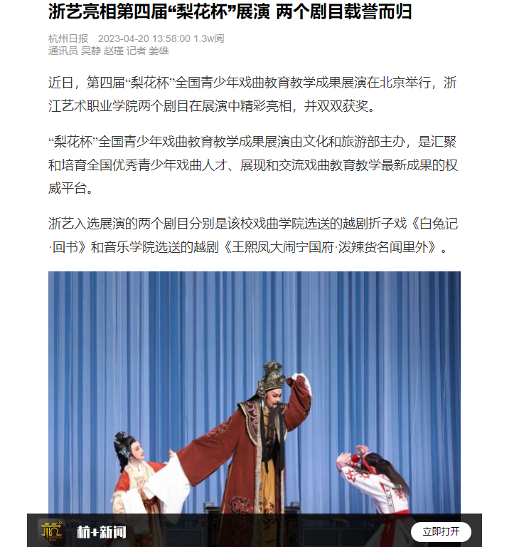 近日,第四届“梨花杯”全国青少年戏曲教育教学成果展演在北京举行,浙江艺术职业学院两个剧目在展演中精彩亮相,并双双获奖。