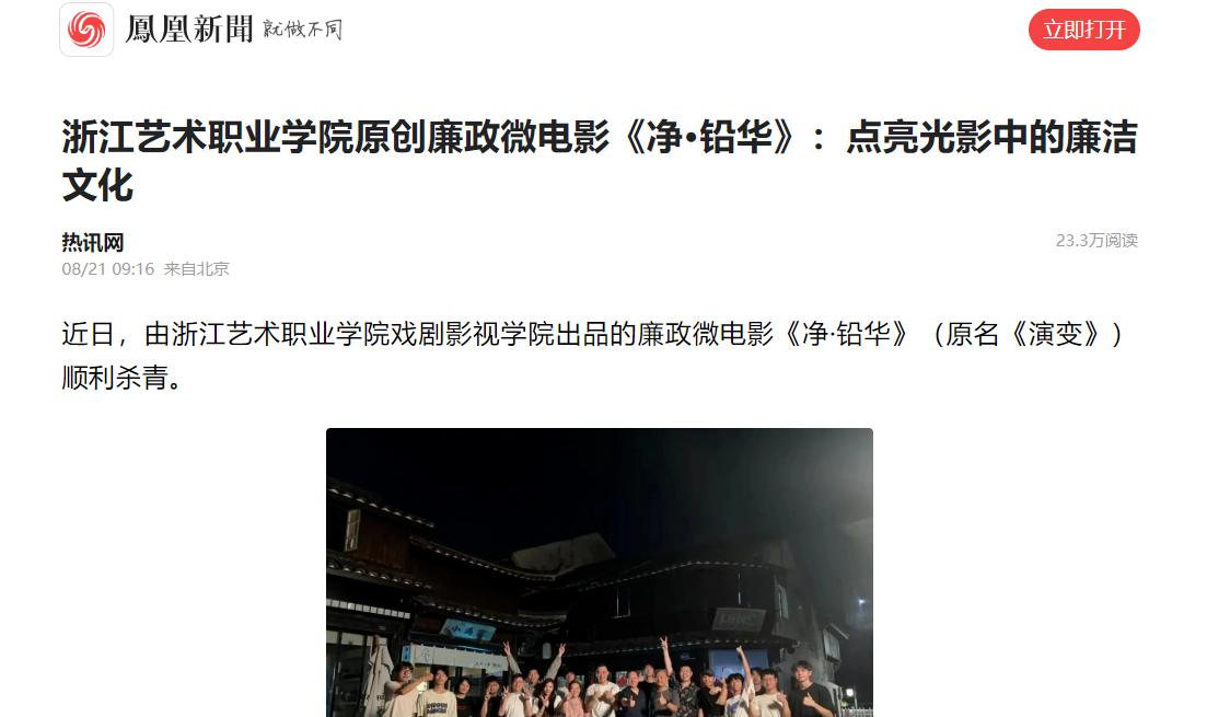 凤凰新闻:浙江艺术职业学院原创廉政微电影《净·铅华》:点亮光影中的廉洁文化