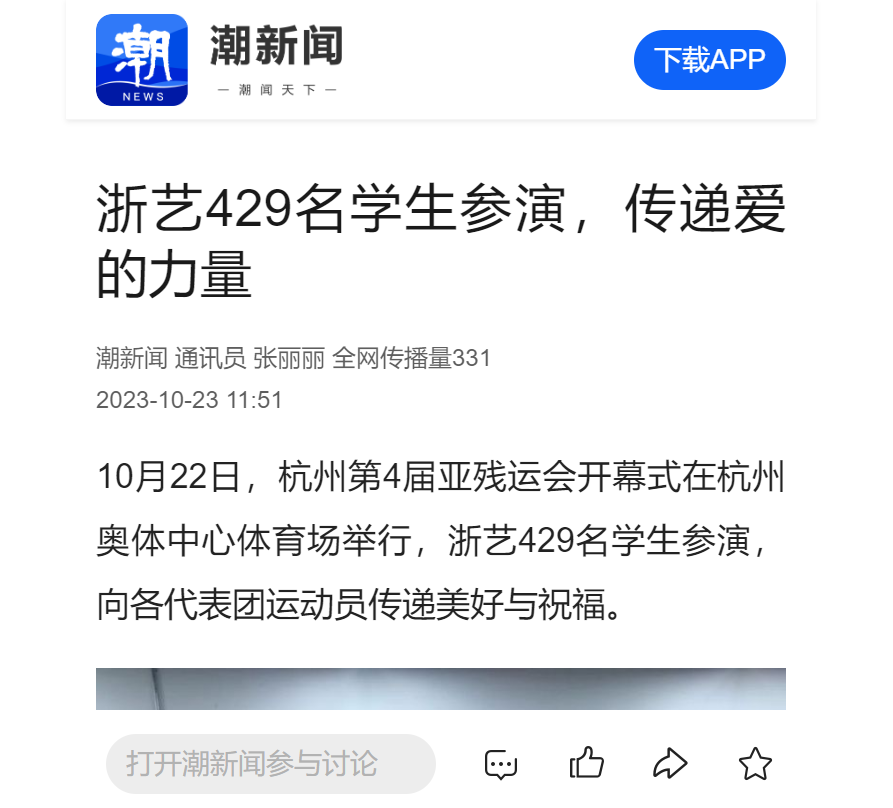 “作为带队老师,在排练过程中,看到了浙艺学子不怕困难、努力拼搏的样子,让我感受到新时代中国青年的担当与责任。亚残运会开幕式不仅展现了中国文化的魅力和竞技体育的激情,更激发了我们的爱国热情和民族自豪感。祝愿运动员们享受比赛,创造佳绩。”音乐学院带队老师陈宏说。