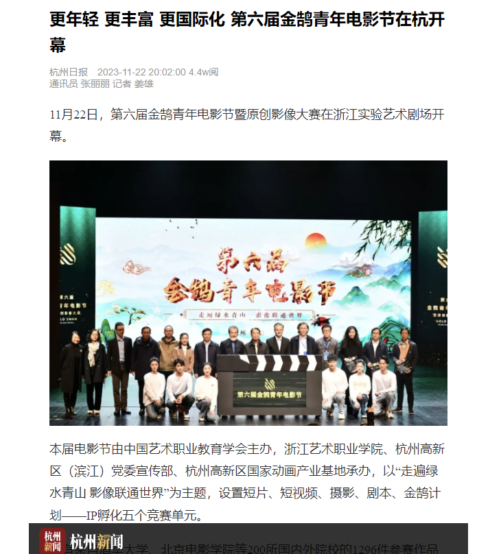 浙江艺术职业学院院长施俊天介绍,与往期相比,今年的电影节有三个特点:更加面向青年,特别是大学生的创作群体;征集的作品数量比往届大幅度增加;国际化趋向更明显,有来自澳大利亚、新加坡等国的嘉宾参与中外学术论坛。他希望通过金鹄电影节,助力更多年轻人展翅高飞。