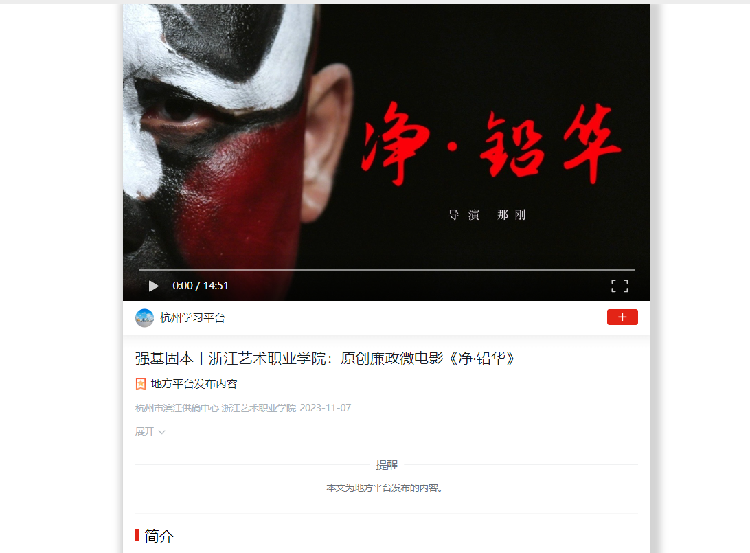 学习强国杭州平台:强基固本丨浙江艺术职业学院:原创廉政微电影《净·铅华》