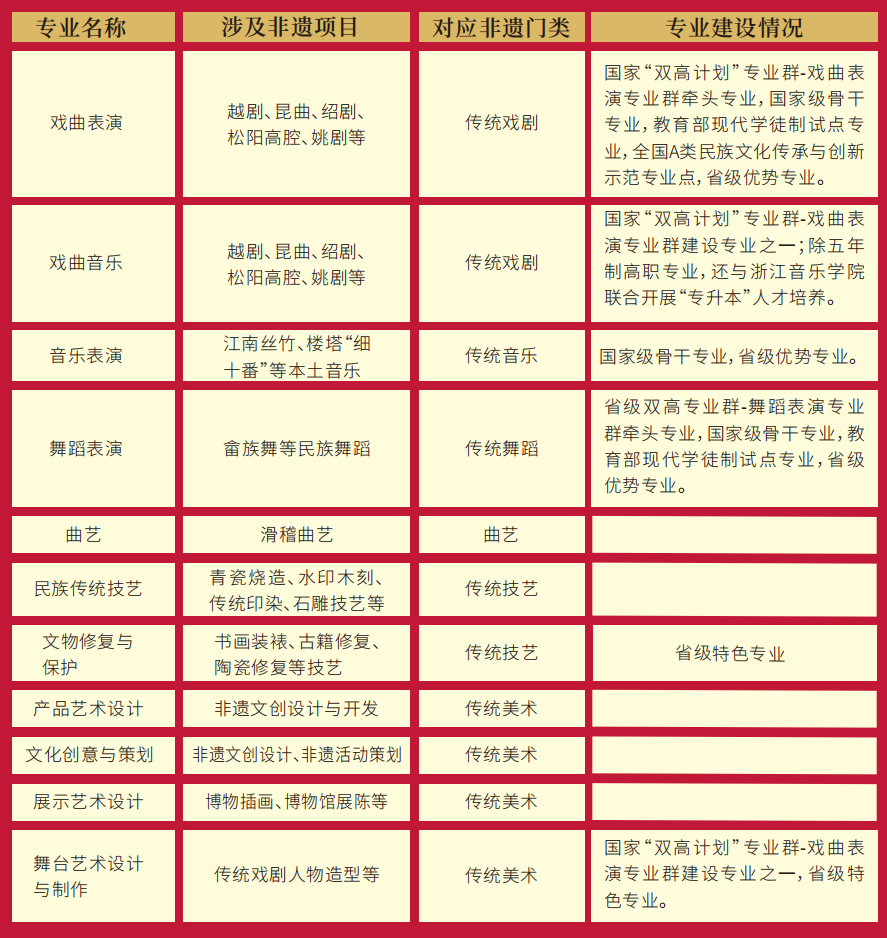 “无论是在教学专业设置还是在科研方面,浙艺都进行了大量投入,成为浙江省非遗保护传承的一个高地。”薛亮介绍,浙江艺术职业学院现在32个高职专业中有非遗相关专业11个,其中国家“双高计划”专业群建设专业就占了3个,此外,还有1个浙江省“双高”专业群建设专业,1个全国A类民族文化传承与创新示范专业点,3个国家级骨干专业,3个教育部现代学徒制试点专业,以及3个省级优势专业和1个省级特色专业,不仅涉及越剧、昆曲、绍剧、松阳高腔、姚剧等传统戏曲,还包括江南丝竹、楼塔“细十番”等本土音乐、畲族舞等民族舞蹈,以及青瓷烧造、水印木刻、传统印染、石雕、书画装裱、古籍修复、陶瓷修复等传统技艺,涉及传统戏剧、传统音乐、传统舞蹈、曲艺、传统技艺和传统美术的六大非遗门类。