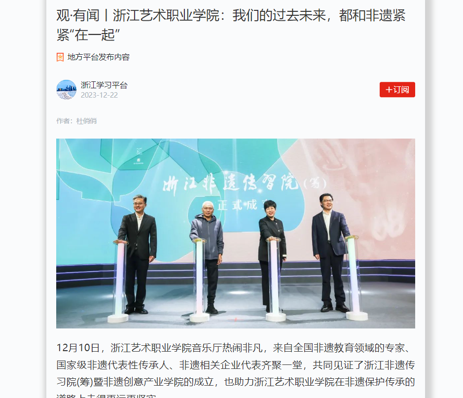 12月10日,浙江艺术职业学院音乐厅热闹非凡,来自全国非遗教育领域的专家、国家级非遗代表性传承人、非遗相关企业代表齐聚一堂,共同见证了浙江非遗传习院(筹)暨非遗创意产业学院的成立,也助力浙江艺术职业学院在非遗保护传承的道路上走得更远更坚实。