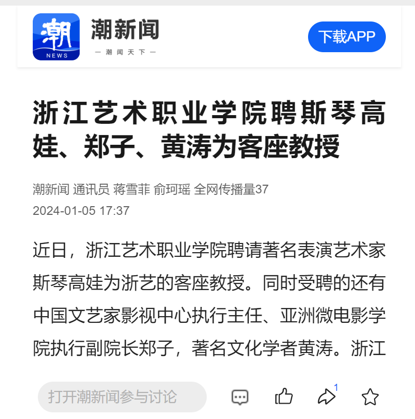 浙江艺术职业学院通过聘请知名表演艺术家进课堂,增进师生与名家之间的交流,为师生的教育教学搭建平台,拓宽师生视野,促进学校高质量发展。