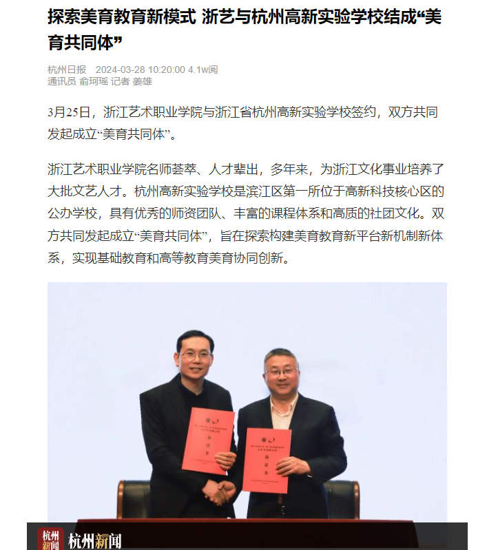 3月25日,浙江艺术职业学院与浙江省杭州高新实验学校签约,双方共同发起成立“美育共同体”。