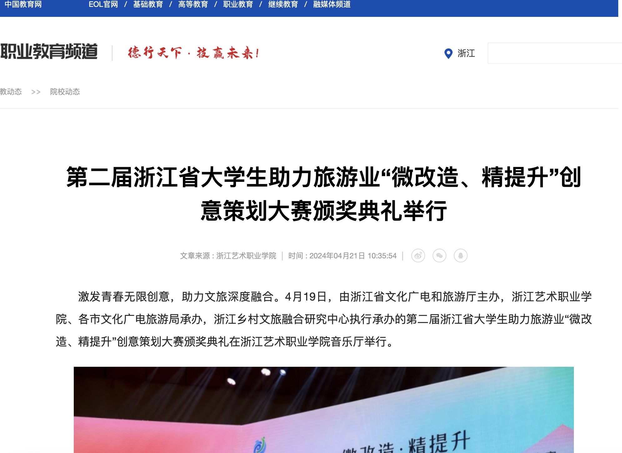激发青春无限创意,助力文旅深度融合。4月19日,由浙江省文化广电和旅游厅主办,浙江艺术职业学院、各市文化广电旅游局承办,浙江乡村文旅融合研究中心执行承办的第二届浙江省大学生助力旅游业“微改造、精提升”创意策划大赛颁奖典礼在浙江艺术职业学院音乐厅举行。