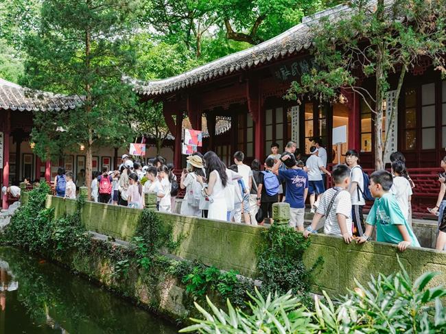 在湖州,他们学习文字的起源与发展,汉字的书写、传播、应用和传承,并亲手创作一幅汉字水墨作品;参观嘉业堂藏书楼、张石铭旧宅、小莲庄等蕴含江南文化深厚底蕴承地方,并将它们用画笔定格在纸上;溯源“两山”文化、寻源湖州历史;聆听非遗传承人的讲述,深入直观地了解湖笔制作项目的工艺流程与技艺特点;体验桑基鱼塘与含山蚕桑养殖等蚕桑文化,综合立体多面地感受中华非物质文化遗产的魅力。在浙江艺术职业学院,通过陶艺体验、漆扇绘制、非遗观摩等,了解学校如何将人才培养、非遗研究和产教融合于一体,让非遗活态传承;在西泠印社,学员们走在百廿名社园林之中,感受传承千年的印文化。