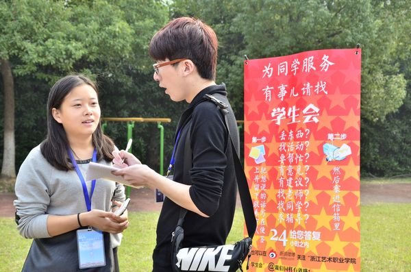 院学生台子设在操场一角。这次为迎接学院运动会,发挥学生会自我管理、自我服务的理念,在每个赛点都安排了大批的学生志愿者,帮助裁判员、保安维持秩序。如若有东西遗失,遇上困难和难题“有事请找学生会”。