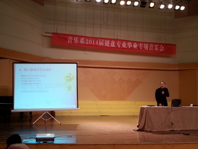 动员会后,杭州市人才服务局毕业生处处长陆敏为毕业生们作题为《“漫谈”求职关键词》的专题讲座。他通过“自我认知”、“了解单位”、“积极主动”、“坚持不懈”、“创业”五个关键词引申到毕业生的求职、简历制作技巧分析。他表示,在求职中要了解自己的特点和长处,寻找最佳的结合点,满足自己,满足企业,并结合实际案例以讲故事的方式给毕业生们传授经验,深受大家的好评。音乐系还邀请专业人士为毕业生们提供专升本信息。