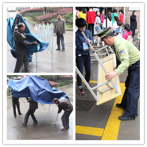 以防下雨,工作人员为各个报名点安置雨棚,排放桌子。