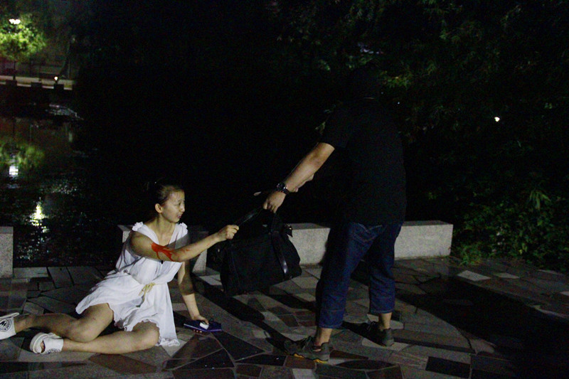 晚19时,一名女生被戴黑色头罩的“恐怖分子”用匕首割伤,包被抢走,同学立刻向“校园110”报警。接警后,校卫队员及时赶到事发现场,第一时间将受伤女生背上校车送往医院救治。紧接着,公安反恐防暴警车到位,在简单的任务分工后,民警和校卫队员在全院范围内搜索“歹徒”,当搜索至食堂二楼后发现“歹徒”已劫持了一名在校女教师作为“人质”。经公安和校卫队员劝解,“人质”成功解救,“歹徒”被制服并押上防暴警车。