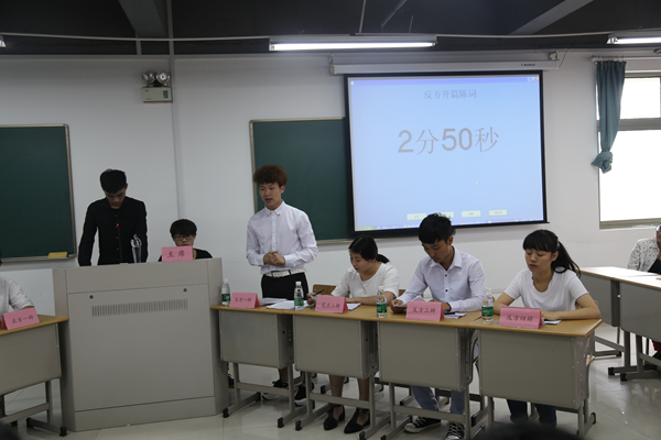 双方辩手入场。正方观点是“先就业后择业”,反方观点是“先择业后就业”,各选手声音洪亮,条理清楚,气氛渐入佳境。最精彩的要属自由辩论,犹如两军对垒,扣人心弦,每个选手都使出浑身解数。还没从精彩部分回过神来,比赛已近尾声,最后正方获得胜利,正方一辩获得本场比赛最佳辩手。