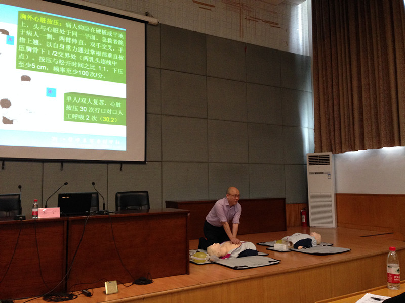朱宁副教授是心肺脑复苏问题方面的专家,他从部分名人、艺术家的突发疾病死亡入手,引导大家认识并正视心脑血管疾病的潜在危险。他介绍了心脏骤停的原因、与其他类似疾病的区别及其应急处理办法。在实践操作环节,他现场为大家演示胸外心脏按压和人工呼吸的具体操作方法,在场的老师们纷纷上前学习、演练并提出自己的疑难问题。他一一给与解答,现场气氛热烈、成效显著。