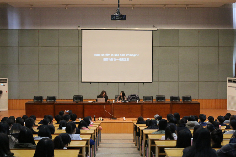 保罗·利帕里,意大利导演、教授、艺术家,曾创作过多部优秀纪录片、宣传片。演讲刚开始,保罗先生用青涩的中文“你好”向大家打招呼,得到了在场老师同学们的热烈掌声。讲座过程中,他提出“in one all movie”的电影概念,即把一整部电影浓缩成一张抽象模糊的色彩画,引起了学生们的极大兴趣。接着,保罗向同学们展示了《杀死比尔》《死灵》《香水》等几部用该理念创作的电影,让大家近距离感受艺术的魅力。在聊到《香水》这部电影时,他说自己就像片中的男主人公,也在追求影片里的“香水”,试着提炼出电影的“魂”。保罗也表示,自己的理念未来不单单只局限于电影,还会把领域拓展到各个方面,真正做到艺术与科技相结合。除此之外,他还播放了自己为各大电视台、公司、博物馆等创作的系列纪录片,震撼的视觉冲击赢来了师生们一次次的惊叹。在观看了保罗多部作品后,现场同学们纷纷与他进行了互动交流。