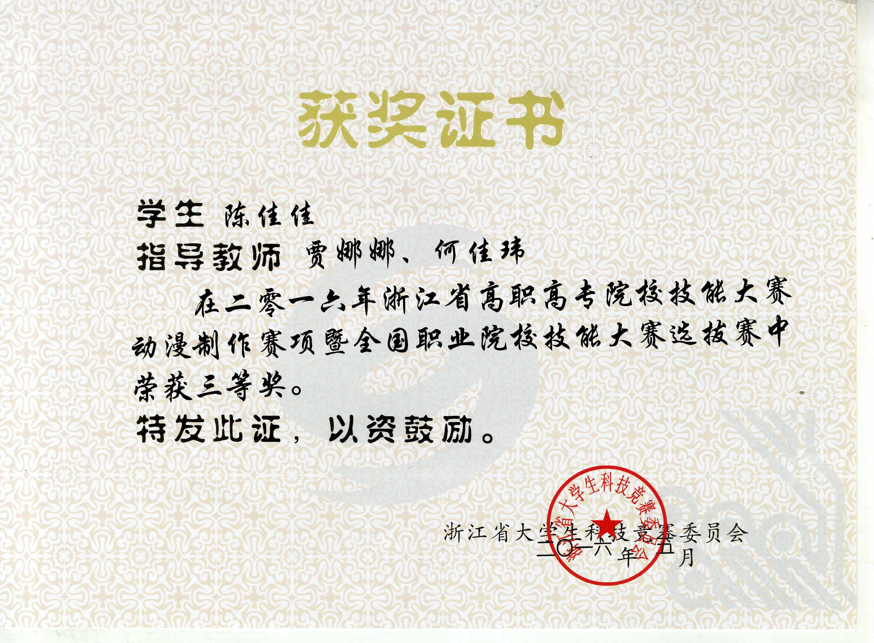 5月6日至8日,浙江省高职高专院校技能大赛动漫赛项在台州职业技术学院举行。我院美术系动画专业学生陈佳佳、翁雨桥和刘家鑫与来自全省众多高职院校的选手竞技,分获三等奖。